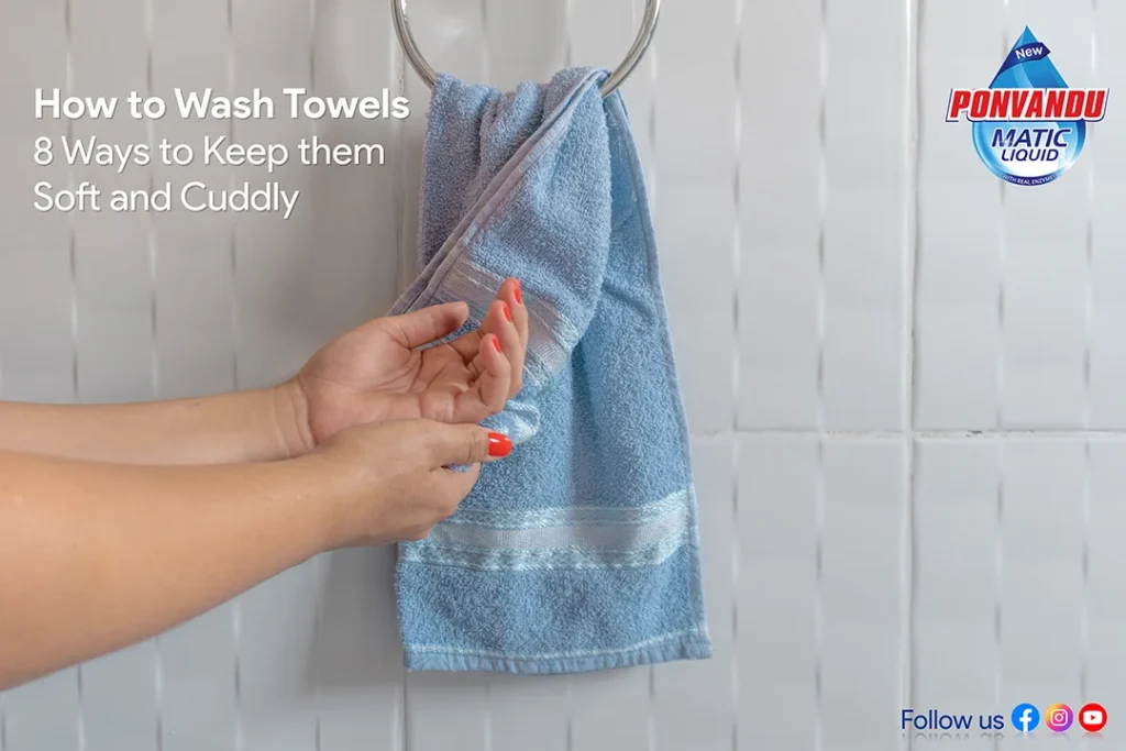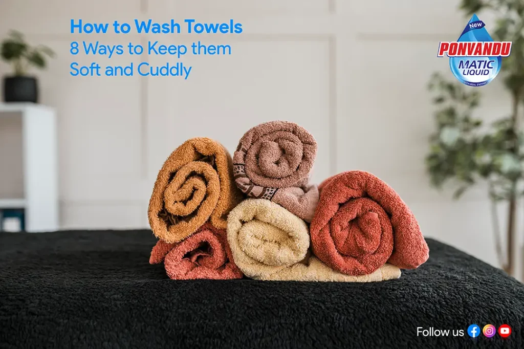 There is a widespread misconception that using more detergent results in better cleaning when washing clothes. When it comes to washing towels, choose the right detergent. Ponvandu Matic Liquid detergent is one of the best. The active ingredients in ponvandu matic liquid remove stains, dirt easily in one wash and retains the softness in your towel. Using more detergent than the recommended amount leaves detergent residue behind. Reduce the amount of detergent used to wash towels so that there is no residue left behind.